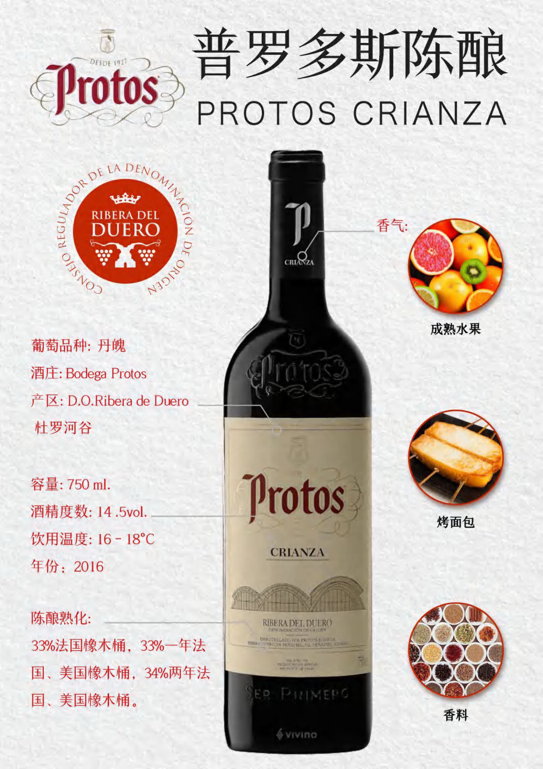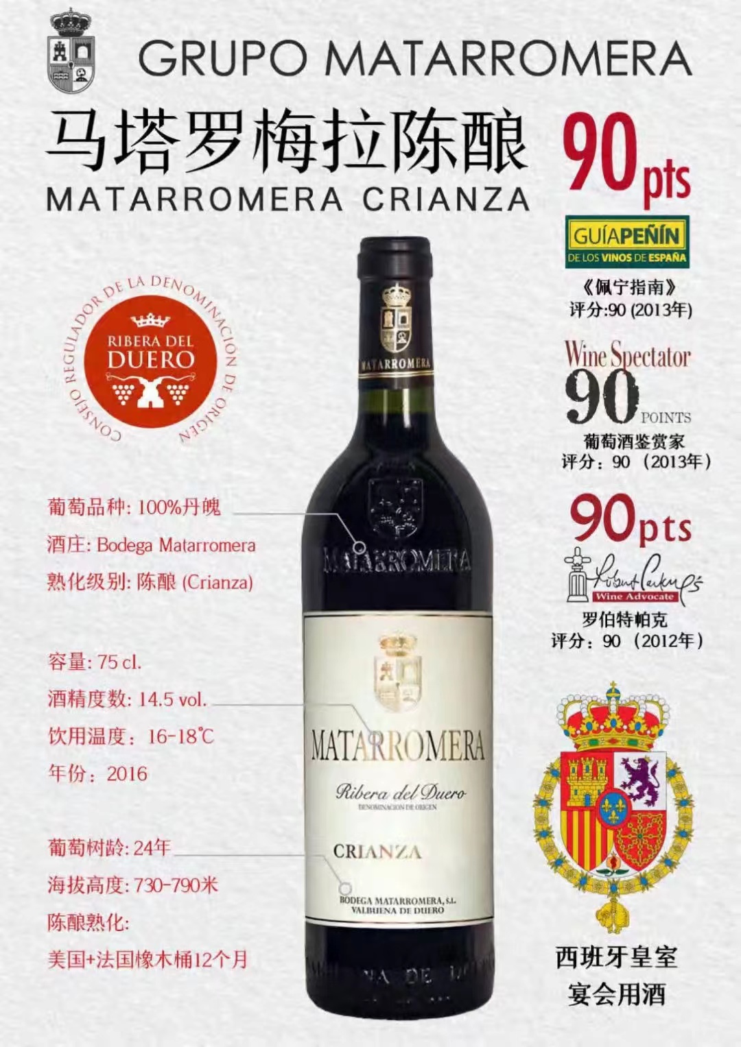 産品:等級:CRIANZA; 年(nián)份:2016; 産區(qū):RIBERA DE DUERO