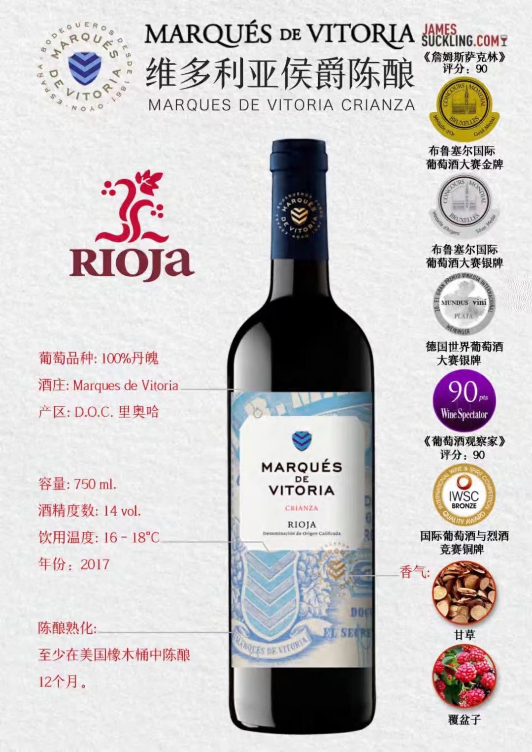産品:等級: CRIANZA; 年(nián)份:2017; 産區(qū):RIOJA